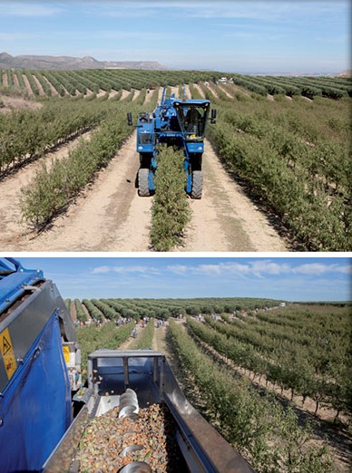 La recolección con máquina cosechadora es una de las ventajas que presenta el Almendro en Seto, pues el fruto se recolecta de forma rápida, económica y aséptica, ya que, al no tocar en ningún momento el suelo, éste no se impregna de ningún tipo de herbicida que se le haya aplicado al terreno con anterioridad. De esta forma, se produce una mejora de la calidad del producto final y se reducen los costes para el agricultor, aumentando, por tanto, su rentabilidad.