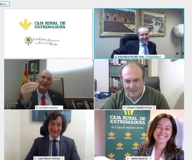 En las distintas reuniones virtuales han participado por parte de Caja Rural de Extremadura el presidente, Urbano Caballo; el director general, José María Portillo; el responsable del área de negocio, Juan Ramón Gómez, y la responsable de Fondo de Educación y Promoción, María Navarro, además del presidente de Cruz Roja, Jesús Palo Tiburcio; el presidente de FEDEXCAZA, José María Gallardo; el presidente de la Lonja Agropecuaria, Florencio Torres, y el presidente del Colegio de Veterinarios, José Martín Sánchez Murillo.
