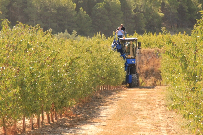 Nosotros decidimos apostar por el modelo superintensivo debido a la mecanización. Nos parecía más rentable porque habíamos visto otras fincas en modelo intensivo, y no cuadraba con nuestras necesidades de trabajo. El modelo superintensivo nos ha permitido la mecanización total siendo las producciones medias muy estables, hasta el punto de que tenemos muchas hectáreas de almendro, y cada vez vemos que funciona mejor. Hemos visto como en el segundo año de almendro super intensivo, las cosechas han llegado a 1.110 kg de pepita por hectárea y en el 3 año a más de 2.200 kg por hectárea. La verdad es que, además, hemos estado probando con diferentes máquinas de recolección y cada vez somos capaces de hacer menos daño al árbol. Es muy importante el buen guiado del árbol para no provocar daños.