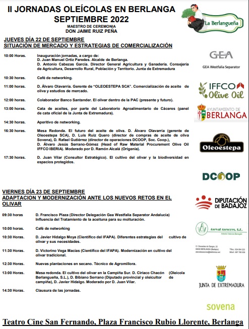 El municipio pacense de Berlanga acogerá el 22 y 23 de Septiembre, una semana antes del inicio oficial de la nueva campaña de olivar para aceite de oliva 2022/2023, sus II Jornadas Oleícolas, en el Teatro Cine San Fernando. Con un elenco de destacados expertos y profesionales del sector de diferentes ámbitos, entre ellos los de destacados grupos envasadores y cooperativas oleícolas como Oleoestepa, Dcoop o Sovena. Así como grandes conocedores del mercado mundial oleícola como el consultor Juan Vilar y destacados expertos en el campo de la agronomía del olivar y las nuevas tendencias de cultivo en el mismo. Unas jornadas que analizará la realidad del sector aceitero y también el desarrollo de la nueva campaña en ciernes que se presente muy complicada por la fuerte caída de la producción que se espera en toda España. Unas jornadas en las que la almazara local, Oleícola Berlangueña, con su gerente Ciriaco Chacón al frente, desempeñan un papel esencial.