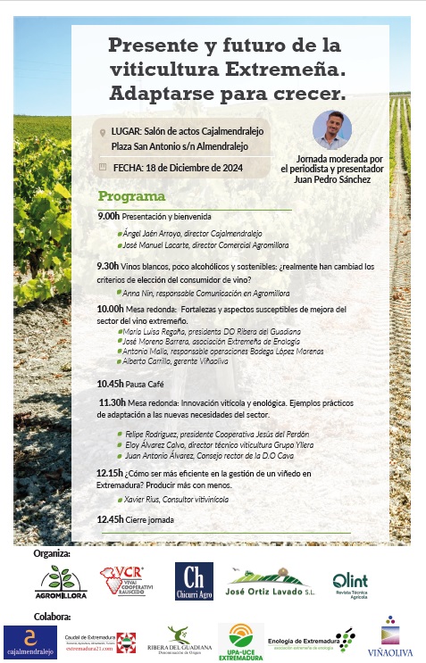 Agromillora organiza el próximo día 18 de diciembre en el Salón de Actos de Cajalmendralejo en Almendralejo la jornada sobre el ”Presente y Futuro de la viticultura extremeña. Adaptarse para crecer” para analizar de la mano de destacados expertos y profesionales este cultivo y sector tan importante en hectáreas y volumen de producción para la Comunidad de Extremadura y la comarca de Tierra de Barros.