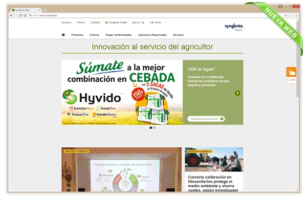 Syngenta España lanza su nueva web, más dinámica e interactiva, que permitirá a los usuarios estar mejor informados acerca de toda la actividad y novedades de la empresa en nuestro país. Accesible desde cualquier dispositivo, móvil, tablet, o pc. Además de facilitar el acceso a todos los productos, catálogos o consejos relativos a las tecnologías de protección vegetal y genética de semillas, sus contenidos se complementan ahora con un mayor contenido divulgativo.