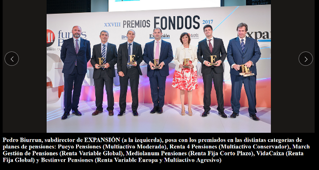 El Plan de Pensiones Banca Pueyo, de la gestora Pueyo Pensiones, ha sido galardonado con el premio al mejor Plan de Pensiones en la categoría Multiactivo Moderado, durante la ceremonia de los prestigiosos premios Expansión-Allfunds, celebrada en la sede de la Bolsa de Madrid.