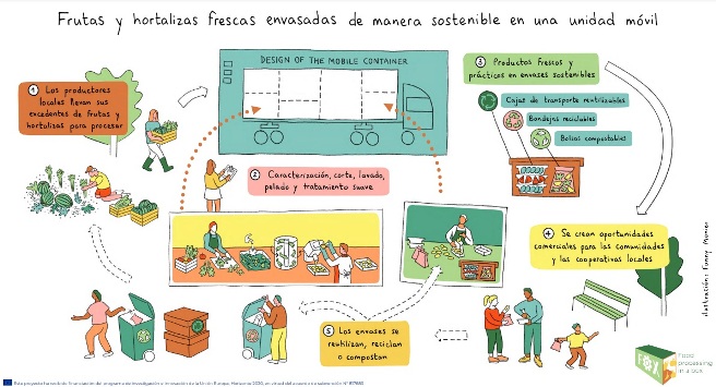 El contenedor dispone del equipo necesario para un procesado suave (lavar, cortar, envasar) de frutas y hortalizas cerca de la explotación agrícola, de modo que puede trasladarse de agricultor a agricultor dentro de una misma zona y utilizarse para procesar distintos tipos de frutas y hortalizas. Uno de los objetivos del proyecto es desarrollar productos de mayor valor añadido o aprovechar subproductos como zumos o snacks. Se están diseñando cuatro tipos de unidades basadas en diferentes tecnologías para diferentes productos. El proyecto está liderado por el centro alemán DIL (Deutsches Institut für Lebensmittel).