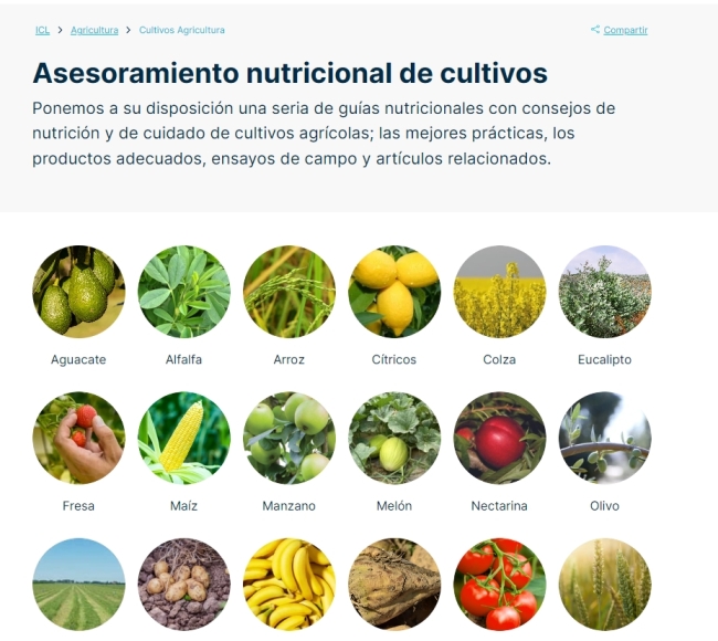 Esta vocación de transmisión de conocimientos técnicos al sector se ve nada más entrar en la web, desde donde con un solo click se tiene acceso tanto a los productos del catálogo de ICL como las soluciones propuestas por la compañía para los diversos cultivos. Especial interés tiene el área denominada “Centro de Conocimiento”, donde podemos encontrar ensayos de campo, artículos técnicos, videos, noticias, testimonios, etc. Otra sección de interés especial es la dedicada a los “Ensayos de campo”, donde se recogen ensayos de cultivos tanto de España como de otros países y regiones con cultivos y climas similares a los de la Península. Estos ensayos se completan con la “Guía de Cultivos” con información específica y planes de abonado para cada cultivo.