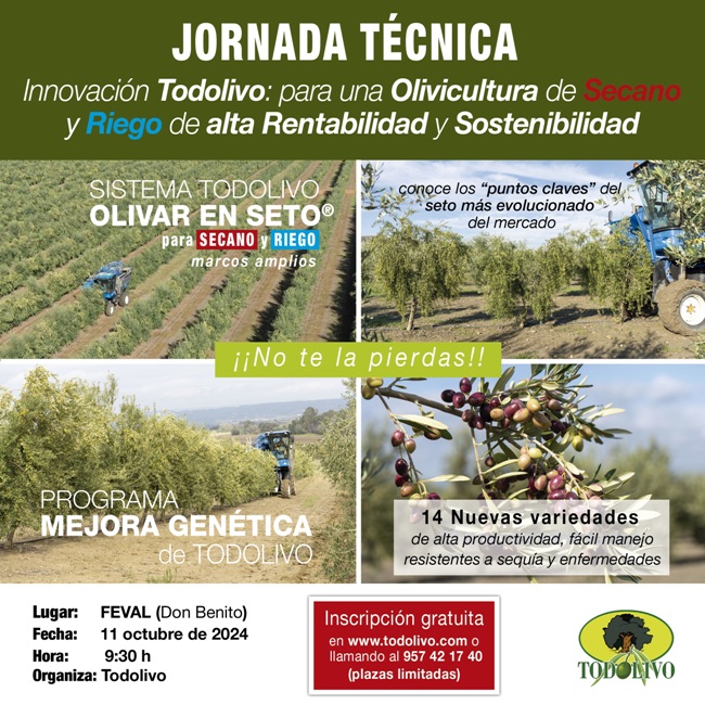 TODOLIVO, empresa de referencia en el sector de olivar en seto, organiza en las instalaciones de FEVAL en Don Benito una Jornada Técnica el próximo 11 de octubre a partir de las 9,30 de la mañana sobre “Innovación TODOLIVO: para una Olivicultura de Secano y Riego de Alta Rentabilidad y Sostenibilidad”.
